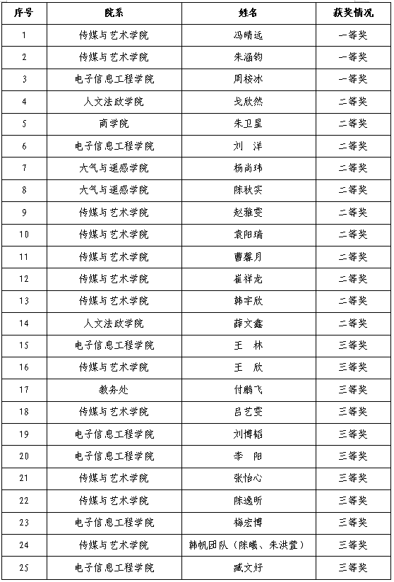 近日,2020年南京信息工程大学校园廉洁文化作品评审结果揭晓,全校共评选出一等奖6项、二等奖15项、三等奖20项,合计41项。我院提交的作品获得一等奖3项、二等奖11项、三等奖11项,共25个奖项,获奖层次和数量在全校各单位中大幅领先。学院荣获“优秀组织奖”。