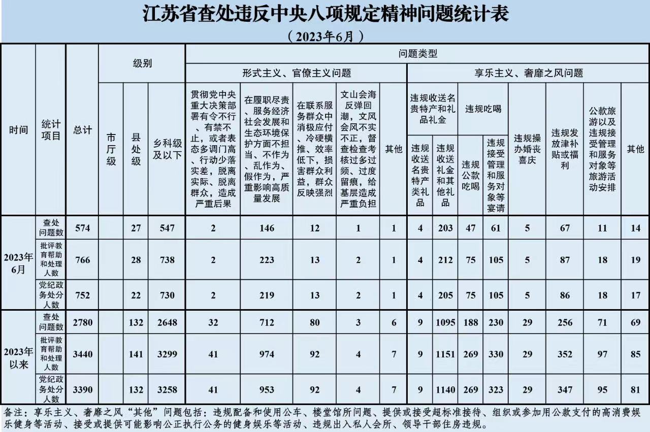2023年6月,全省共查处违反中央八项规定精神问题574起,批评教育帮助和处理766人、其中给予党纪政务处分752人。从问题类型看,查处形式主义、官僚主义问题162起、批评教育帮助和处理241人,查处享乐主义、奢靡之风问题412起、批评教育帮助和处理525人。从人员级别看,批评教育帮助和处理县处级干部28人、乡科级及以下人员738人。