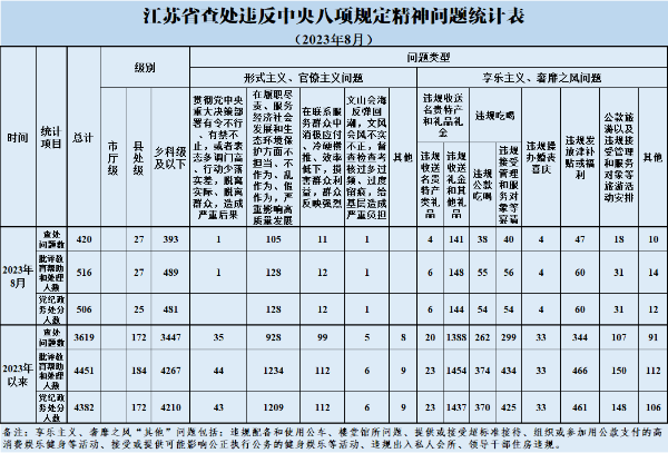 2023年8月,全省共查处违反中央八项规定精神问题420起,批评教育帮助和处理516人、其中给予党纪政务处分506人。从问题类型看,查处形式主义、官僚主义问题118起、批评教育帮助和处理142人,查处享乐主义、奢靡之风问题302起、批评教育帮助和处理374人。从人员级别看,批评教育帮助和处理县处级干部27人、乡科级及以下人员489人。(来源:江苏省纪委监委)
