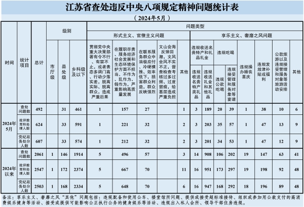 2024年5月,全省共查处违反中央八项规定精神问题492起,批评教育和处理624人、其中给予党纪政务处分607人。从问题类型看,查处形式主义、官僚主义问题186起、批评教育和处理256人,查处享乐主义、奢靡之风问题306起、批评教育和处理368人。从人员级别看,批评教育和处理县处级干部33人、乡科级及以下人员591人。
