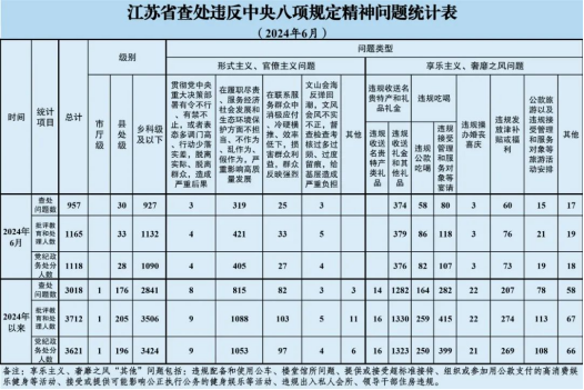 2024年6月,全省共查处违反中央八项规定精神问题957起,批评教育和处理1165人、其中给予党纪政务处分1118人。从问题类型看,查处形式主义、官僚主义问题350起、批评教育和处理463人,查处享乐主义、奢靡之风问题607起、批评教育和处理702人。从人员级别看,批评教育和处理县处级干部33人、乡科级及以下人员1132人。