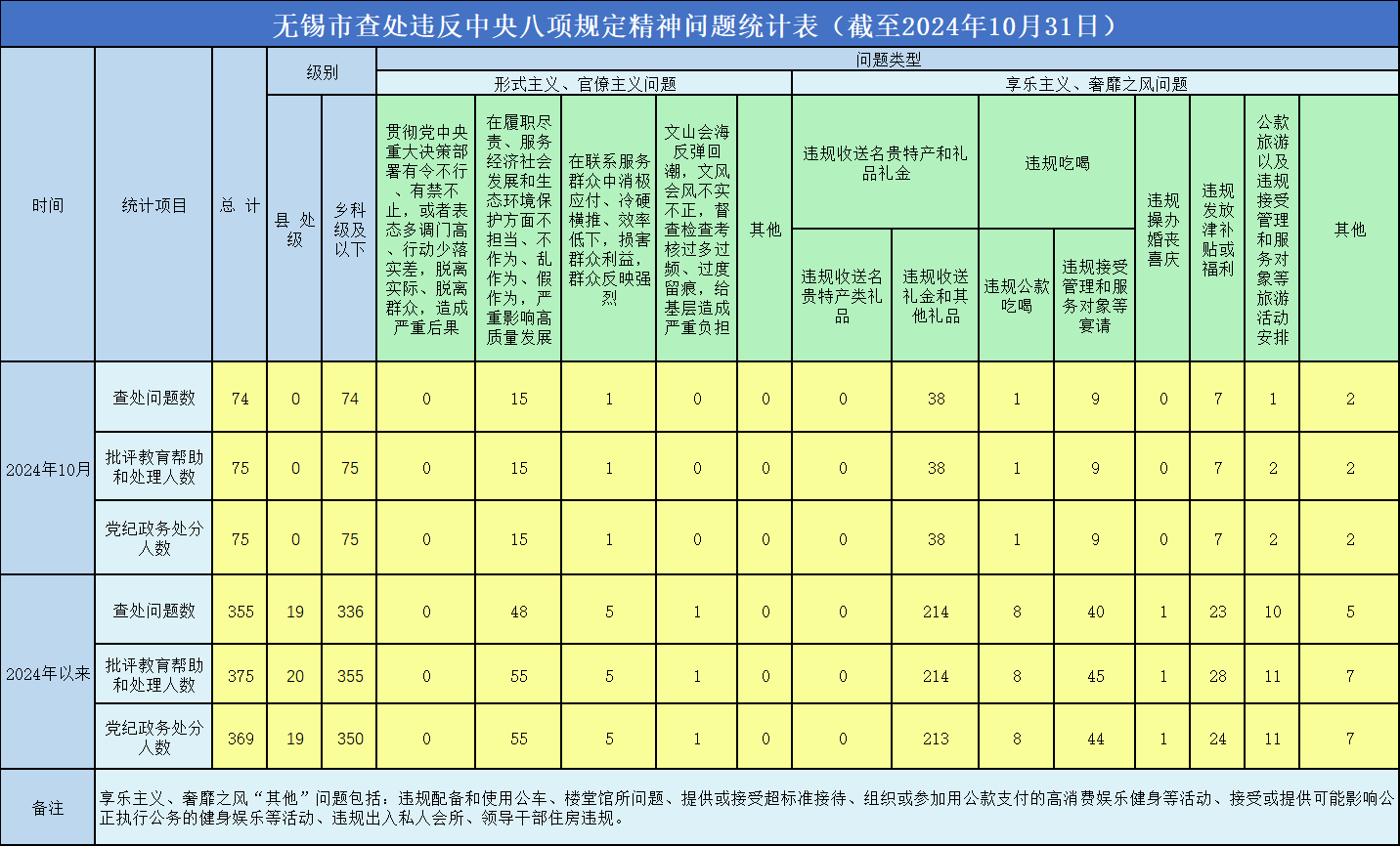 2024年以来,截至10月31日,全市查处违反中央八项规定精神问题情况如下: