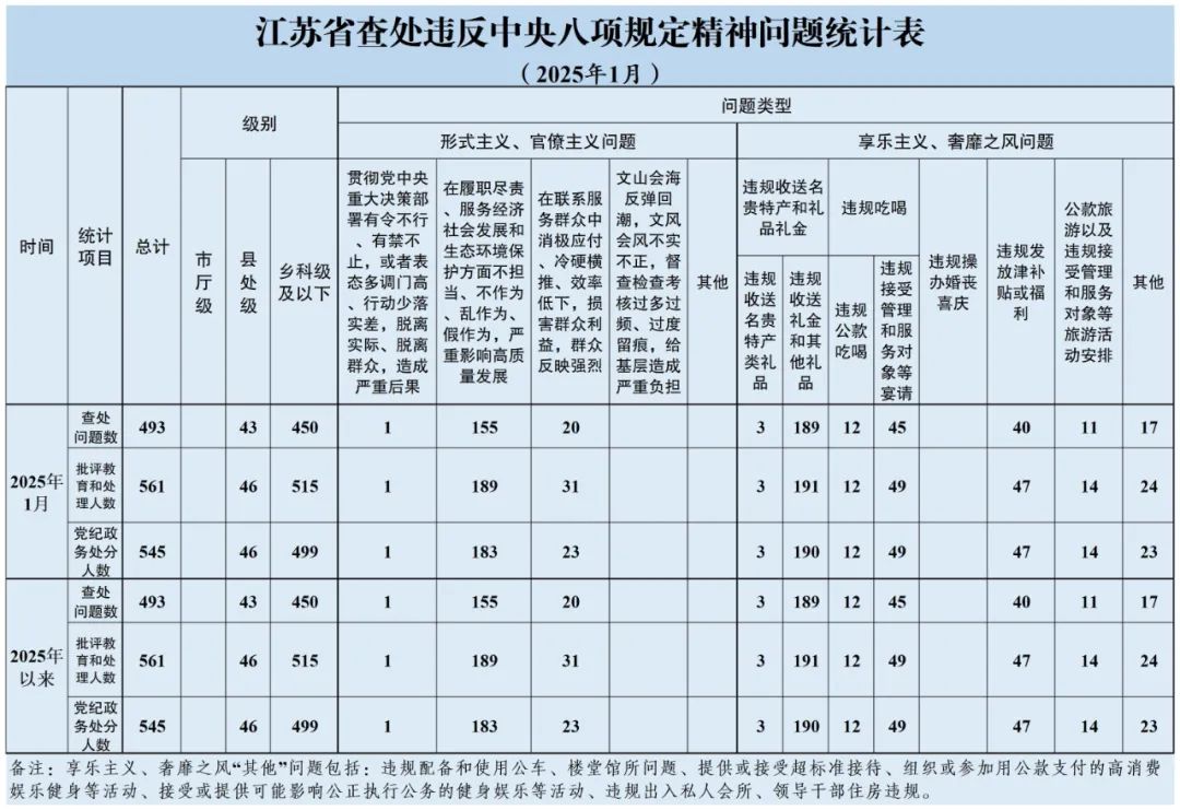 2025年1月,全省共查处违反中央八项规定精神问题493起,批评教育和处理561人、其中给予党纪政务处分545人。从问题类型看,查处形式主义、官僚主义问题176起、批评教育和处理221人,查处享乐主义、奢靡之风问题317起、批评教育和处理340人。从人员级别看,批评教育和处理县处级干部46人、乡科级及以下人员515人。