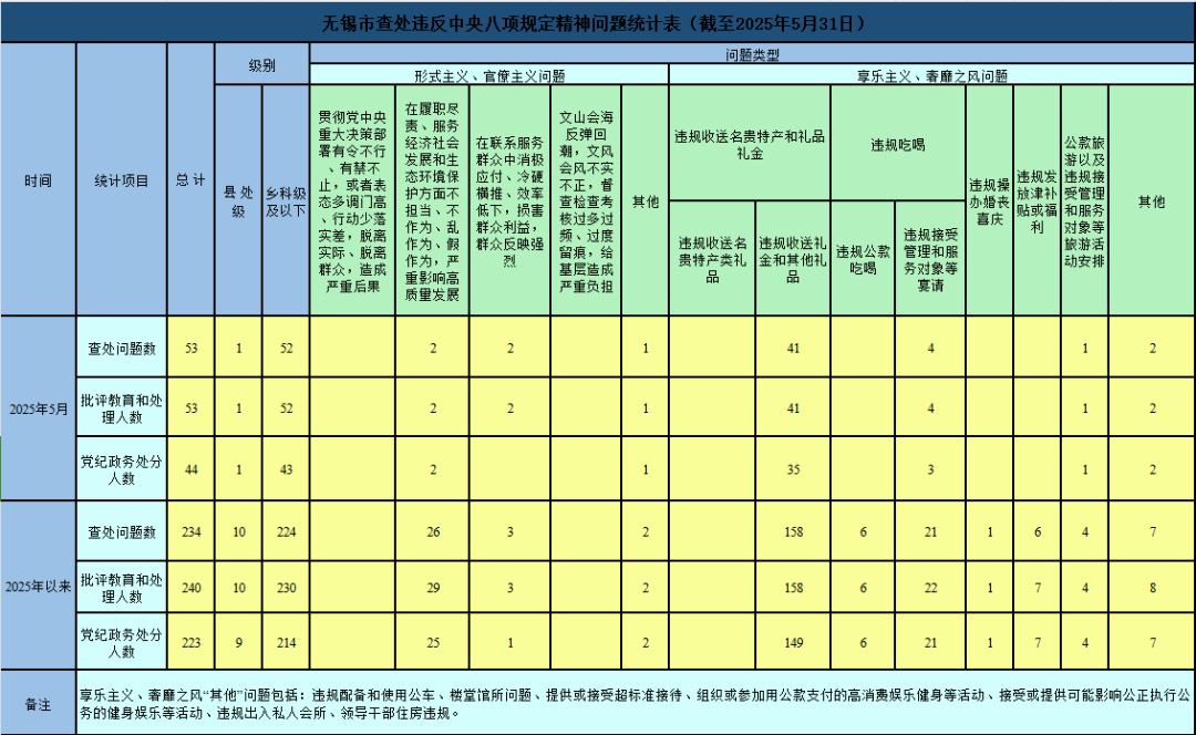 2025年以来,截至5月31日,全市查处违反中央八项规定精神问题情况如下: