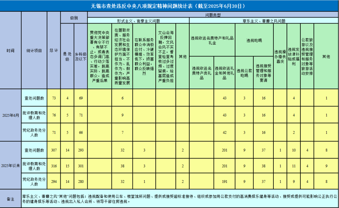 2025年以来,截至6月30日,全市查处违反中央八项规定精神问题情况如下: